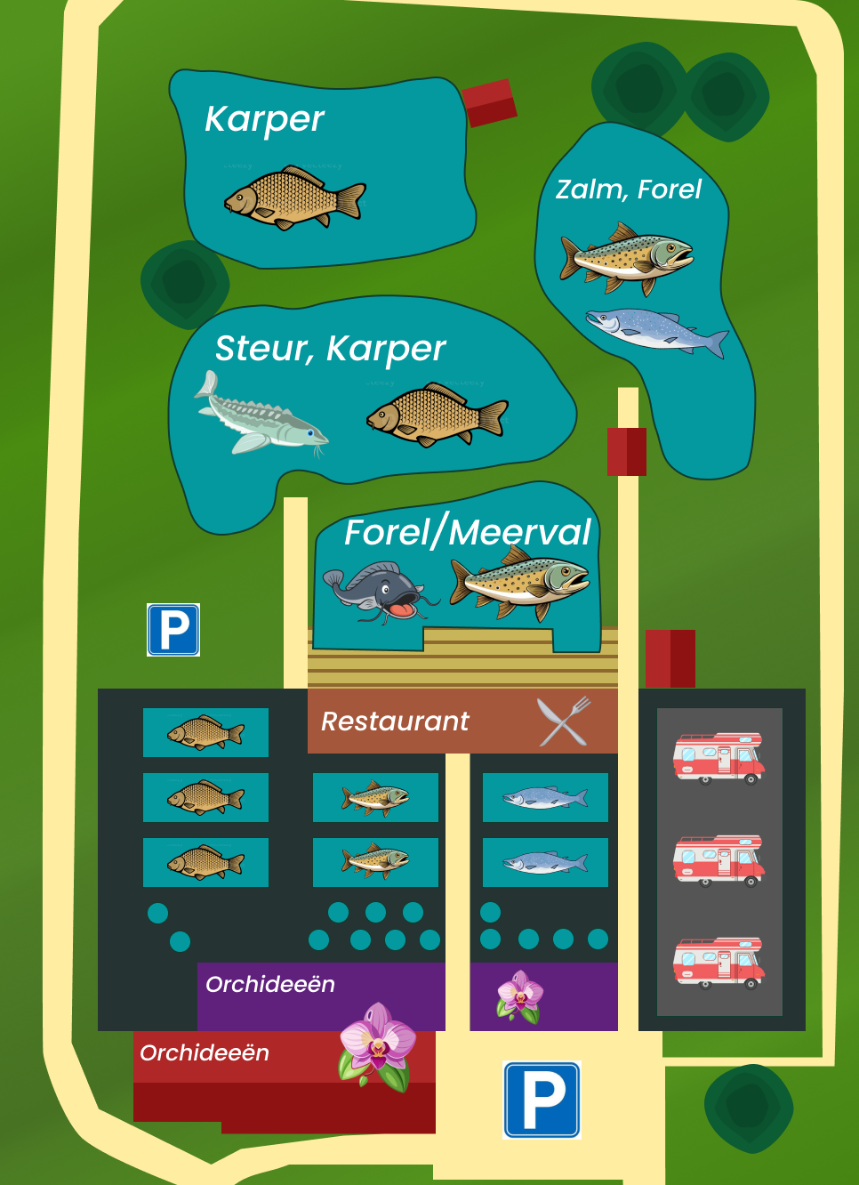 Ons vispark is overzichtelijk en ruim opgezet met meerdere vijvers, elk speciaal ingericht voor een andere vissoort. Je vindt hier visvijvers met regenboogforel, zalmforel, steur, karper en meerval.