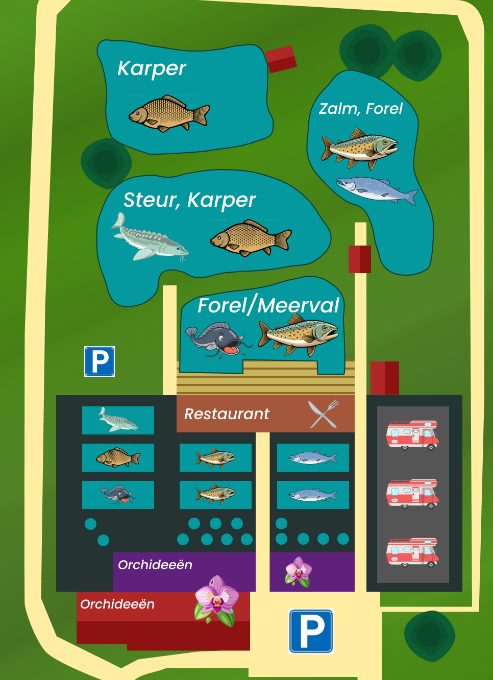 Ons vispark is overzichtelijk en ruim opgezet met meerdere vijvers, elk speciaal ingericht voor een andere vissoort. Je vindt hier visvijvers met regenboogforel, zalmforel, steur, karper en meerval.